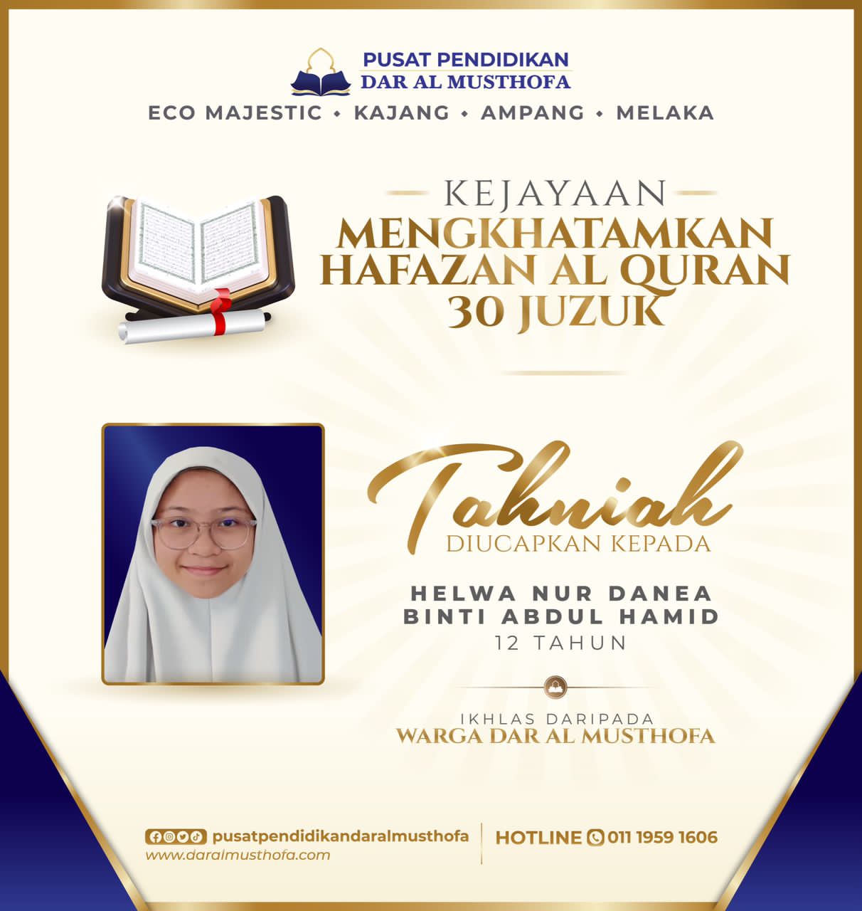 Kami mendoakan semoga adik Helwa Nur Danea Binti Abdul Hamid sentiasa dalam rahmat dan kasih sayang Allah asbab keberkatan Al Quran yang dijaga dengan baik.